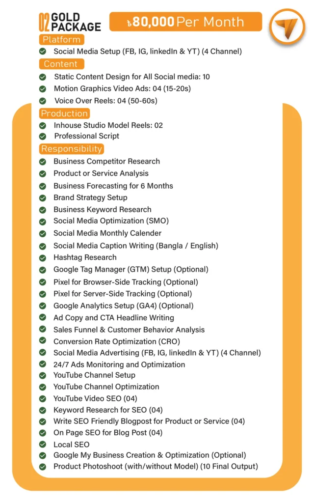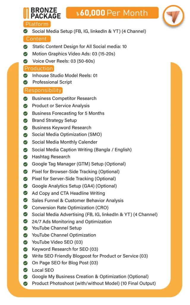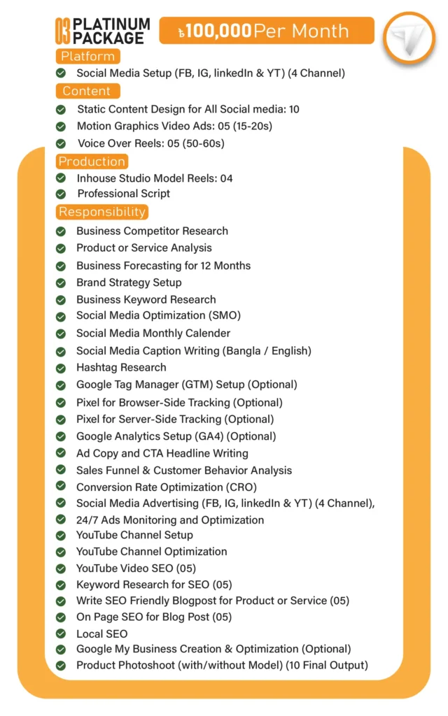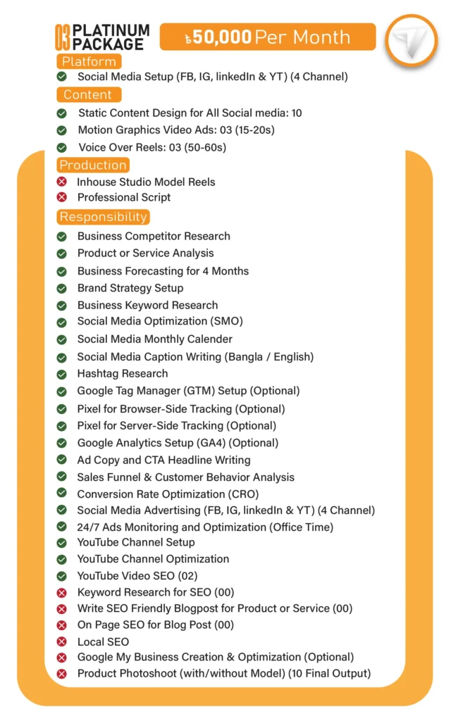 Economy প্যাকেজ মূলত ছোট ব্যবসা বা স্টার্টআপদের জন্য, যেখানে কম খরচে কনটেন্ট দেওয়া হয়। Professional প্যাকেজে থাকছে ফুল ব্র্যান্ডিং, ভিডিও অ্যাড, ট্র্যাকিং, SEO, ক্যাম্পেইন ও ইনফ্লুয়েন্সার কনটেন্ট সাপোর্ট।
